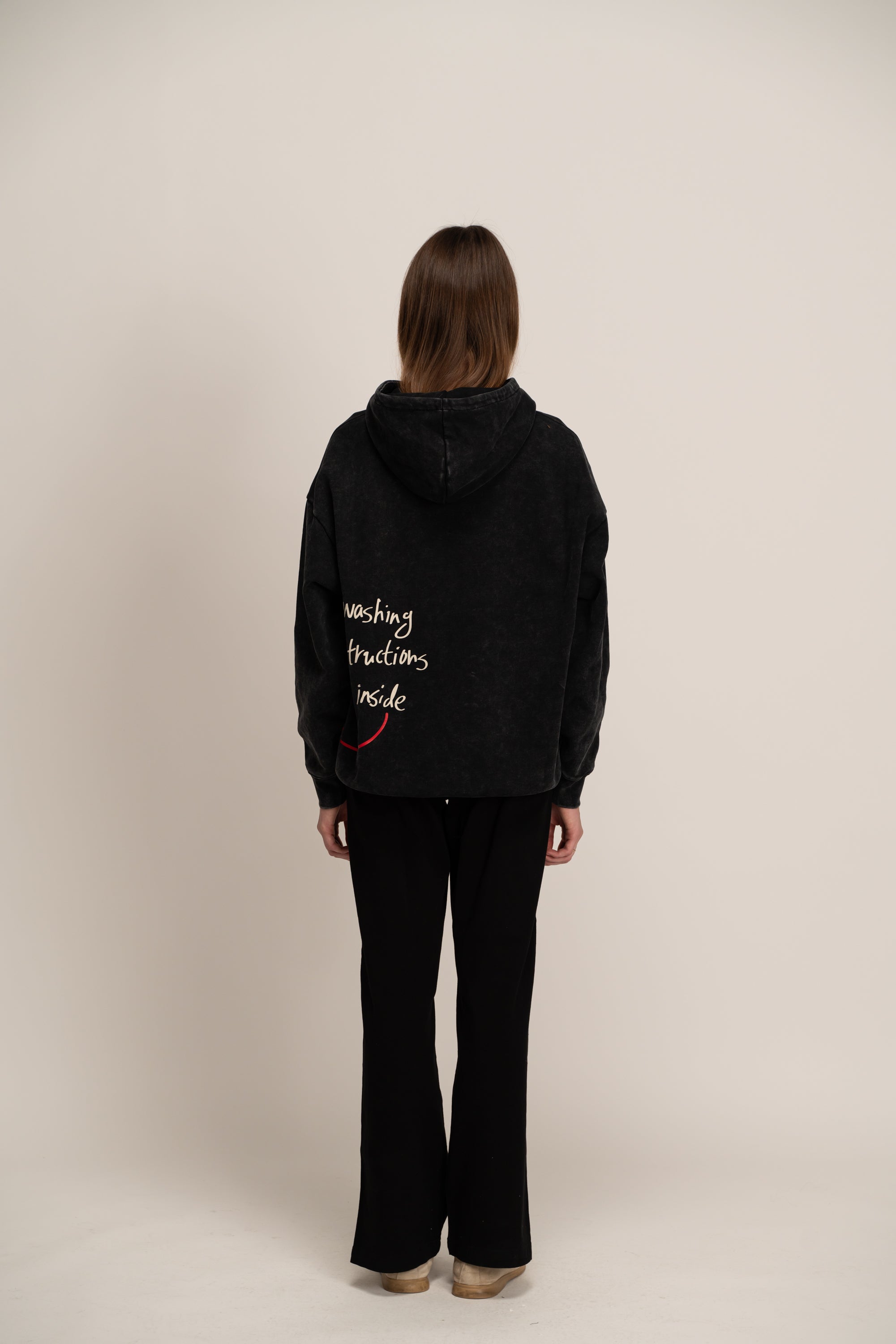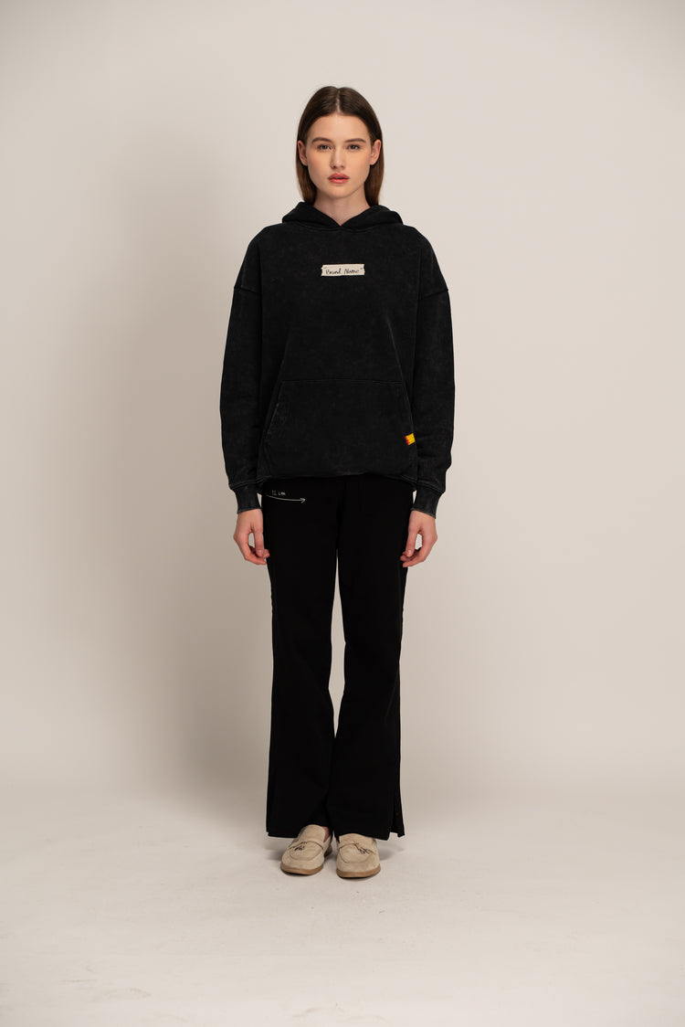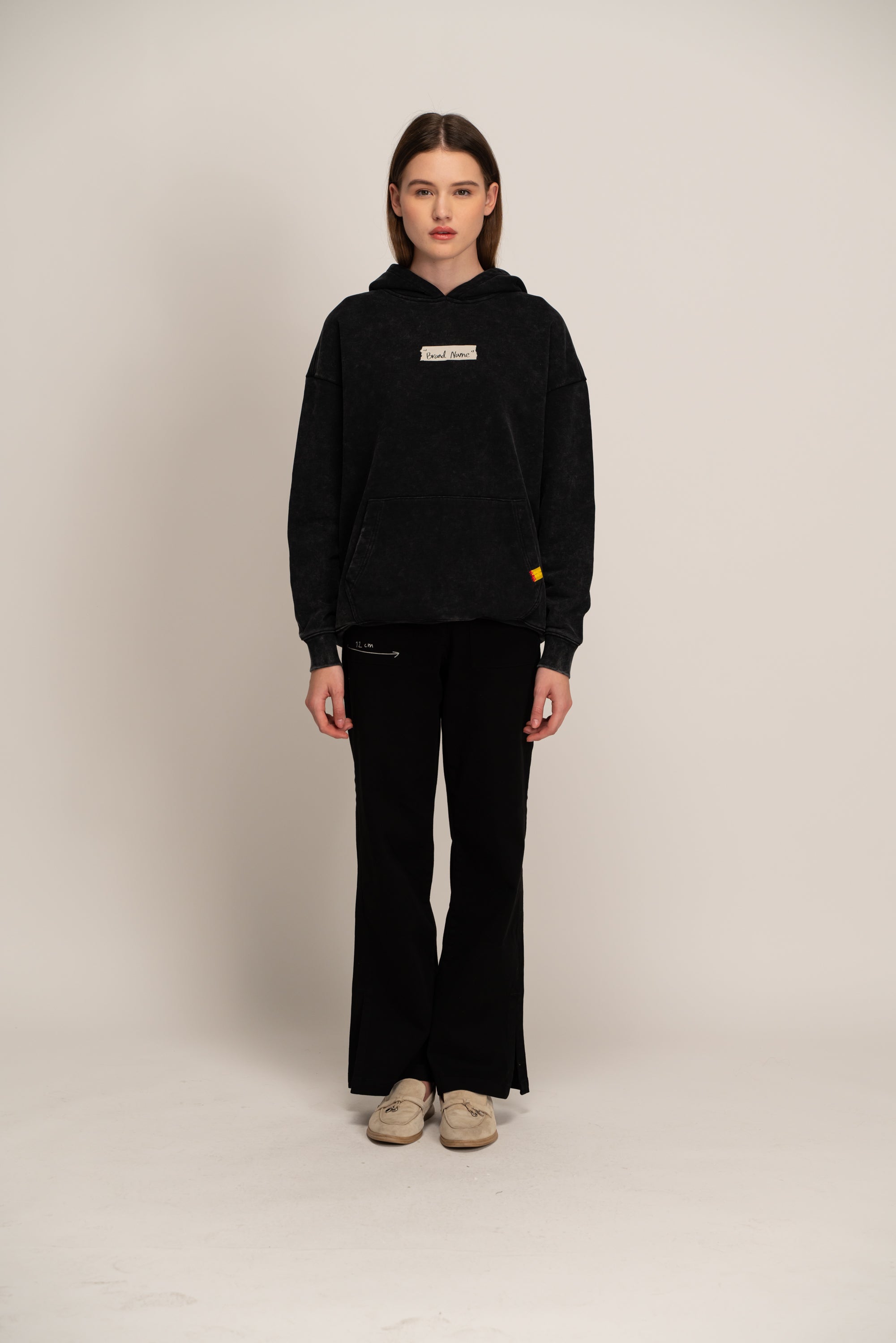 هودي من القطن الفرنسي 100% بوزن متوسط وتشطيب أسود مغسول لمظهر نظيف وعصري. مصمم بقصة مريحة، وجيب عملي، وطباعة بسيطة للارتداء اليومي العصري.